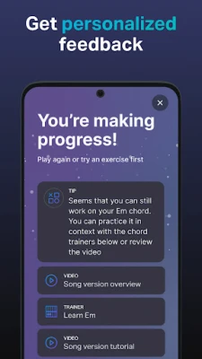 No GuitarTuna je mnogo više od samog ugađanja. Uronite u opsežnu kolekciju od preko 20.000 popularnih pjesama globalnih umjetnika, dostupnih uz profesionalne tabulature i akorde. Odaberite pjesme prilagođene vašoj razini vještine i svirajte vlastitim tempom, uz akorde i tabulature koje se sinkroniziraju s vama. Svaki tjedan dodaju se nove pjesme, osiguravajući vam beskrajnu inspiraciju. Poboljšajte svoje sviranje uz interaktivne trenere i video tutorijale. Dobijte personalizirane povratne informacije i kreirajte vlastiti put učenja kako biste brzo napredovali i ovladali gitarom uz savjete stručnih gitarista.