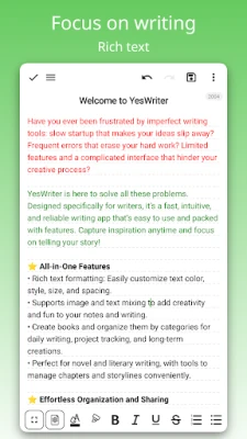 YesWriter je brza, intuitivna i pouzdana aplikacija za pisanje i bilježenje. Jednostavna za korištenje, s bogatim značajkama, neophodan je alat za stvaranje književnih djela, pisanje romana, razradu ideja, bilježenje misli, upravljanje popisima obaveza i poticanje umjetničkog stvaralaštva.